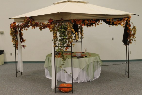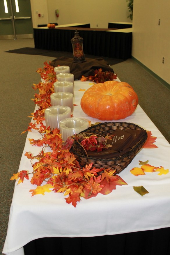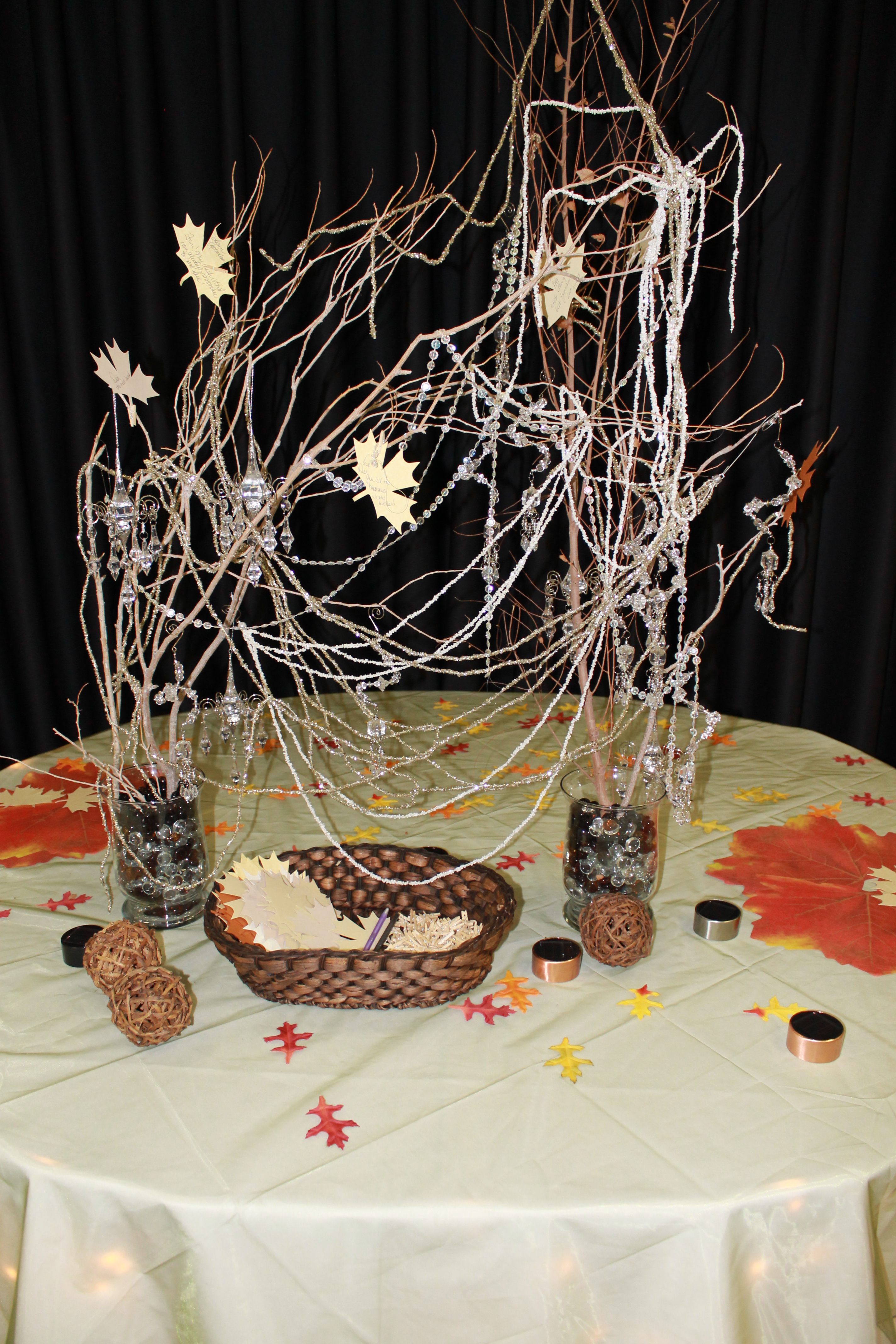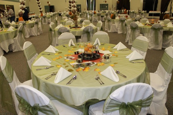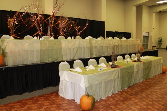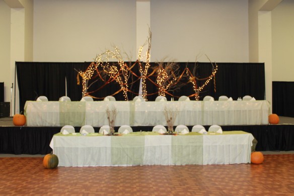 Lighted tree branches stood behind the underlit head tables on the stage at the front of the auditorium.