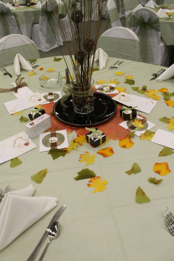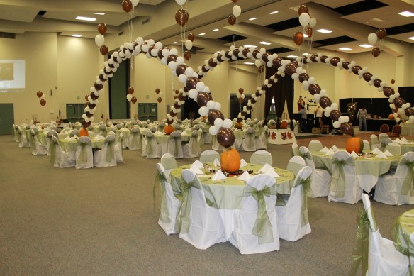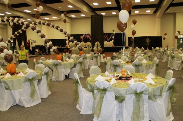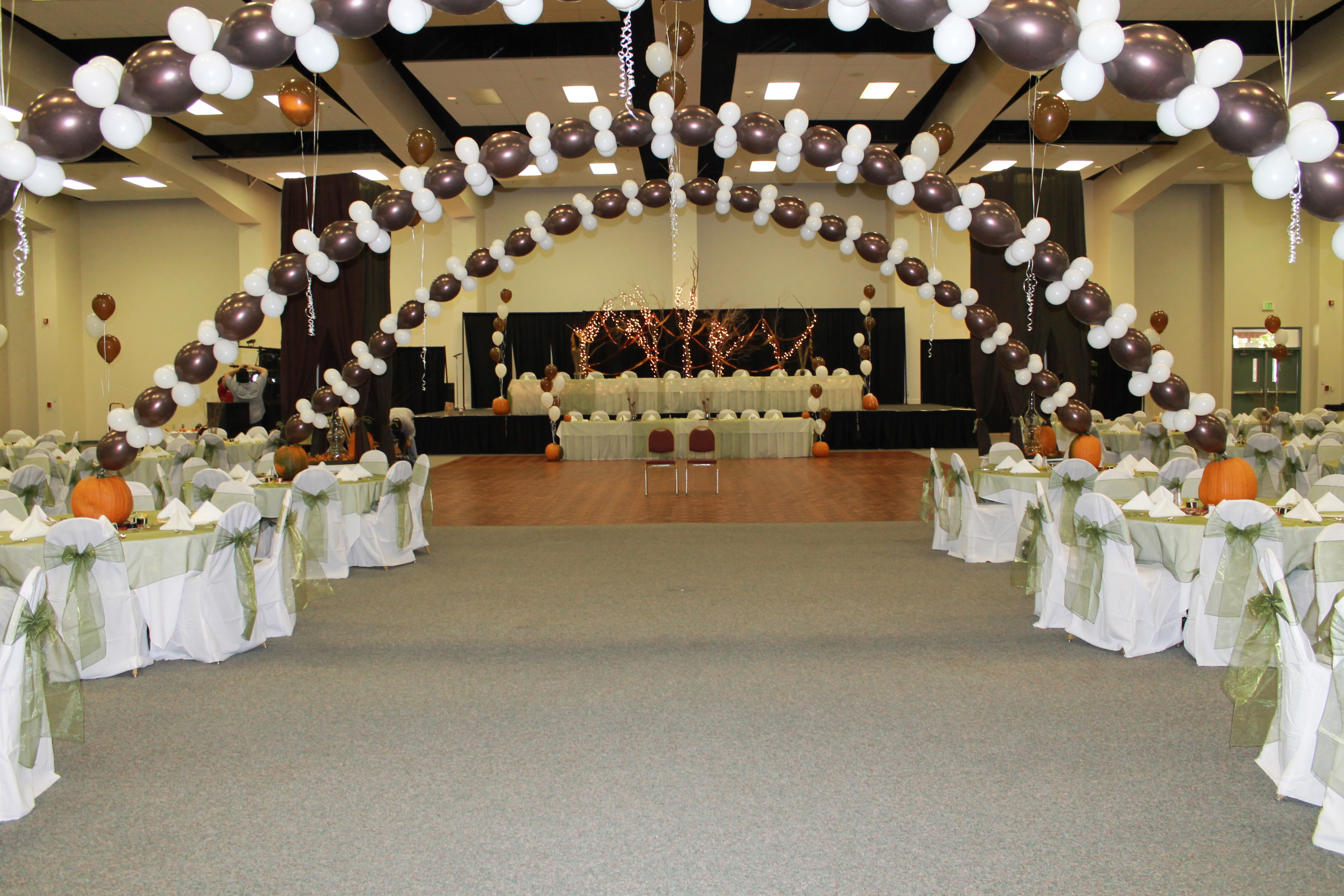 The tables and chairs were covered with willow green overlays and sashes along with chocolate-colored gift boxes and charger and glass centerpieces. Chocolate and white balloon arches lined the entry way for the traditional hispanic marcha, and thirteen foot tall spinning turntables stood at the dance floor corners.